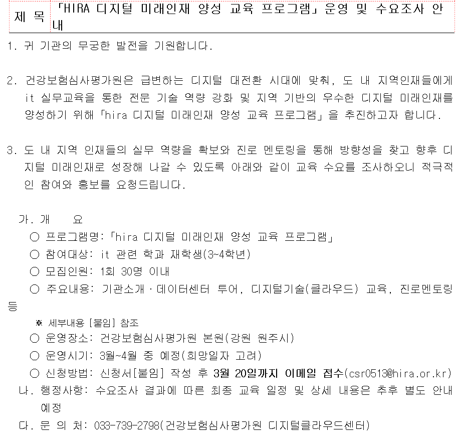 「HIRA 디지털 미래인재 양성 교육 프로그램」운영 및 수요조사 안내