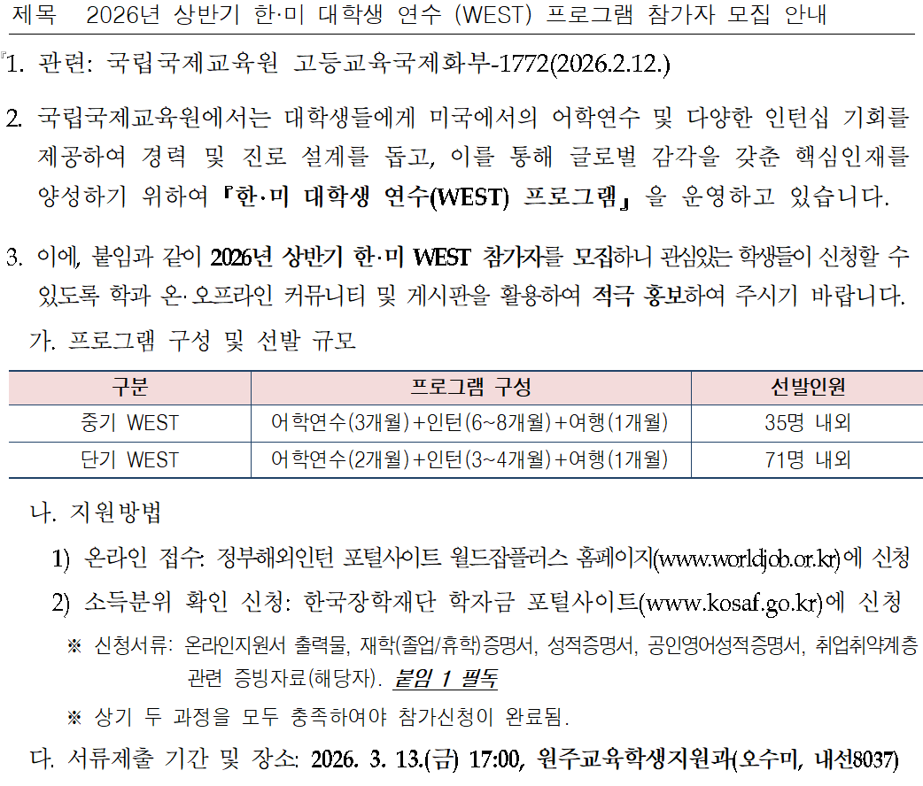 2026년 상반기 한·미 대학생 연수 (WEST) 프로그램 참가자 모집 안내