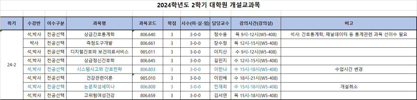 2024학년도 2학기 대학원 시간표 변경사항 안내