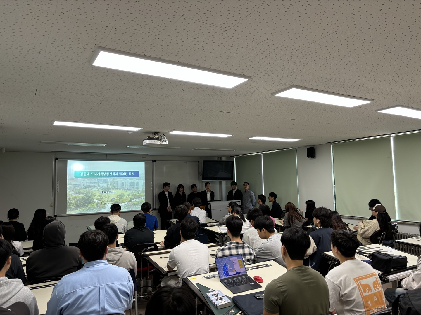 2024년 5월 27일(월), 도시계획·부동산학과에서는 학과 졸업생 동문을 초청하여 동문특강을 개최하였다. 이번 동문특강은 6명의 동문(13학번 정범수-한국토지주택공사, 16학번 전도희-주택도시보증공사, 11학번 강병현 도화엔지니어링, 13학번 김강산-한국종합기술, 15학번 윤태영-경호엔지니어링, 15학번 문준영-삼경)이 참여하였으며 본인들의 취업한 분야에 대한 소개 및 취업정보 및 준비과정 등 재학생들이 정말 알고 싶어하는 내용에 대한 강연을 진행하였다.