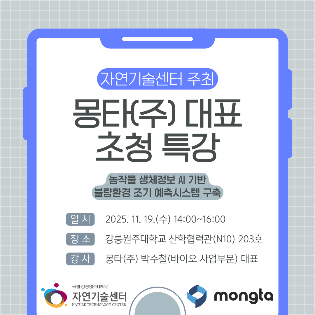 - 행사명 : 행사명: 몽타(주) 대표 초청 특강 「농작물 생체정보 AI 기반 불량환경 조기 예측시스템 구축」