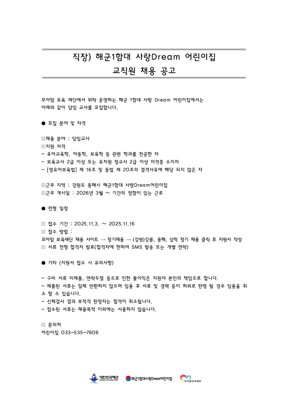 fnctId=bbs,fnctNo=208 해군1함대 사랑Dream 어린이집 교직원 채용 작성일 2025.11.10 작성자 신시원 조회수 549 첨부파일 첨부파일이(가) 없습니다. 다음글 강릉원주대학교 해람어린이집 보육교직원 모집 공고 신시원 2025-11-17 14:27:43.0 이전글 2025학년도 봉대초등학교병설유치원 하계 방학 중 방과후과정 인력 채용 공고 신시원 2025-06-20 09:24:39.0 총 16 개의 게시물이 있습니다. 게시물 검색 제목 작성자 게시글 리스트 취업정보 번호 제목 작성자 작성일 댓글 조회수 첨부파일 16 강원특별자치도자연학습원 직원 공개 채용 신시원 2026.01.12 0 332 1 15 강릉원주대학교 해람어린이집 보육교직원 모집 공고 신시원 2025.11.17 0 773 1 14 해군1함대 사랑Dream 어린이집 교직원 채용 신시원 2025.11.10 0 549 0 13 2025학년도 봉대초등학교병설유치원 하계 방학 중 방과후과정 인력 채용 공고 신시원 2025.06.20 0 2101 0 12 하이원 정선 어린이집(강원랜드 직장어린이집(한솔보육재단)) 보육교사 채용 공고 신시원 2024.07.17 0 5872 0 11 <원주소방서어린이집 담임교사 구인> 신시원 2024.03.11 0 5830 0 10 근로복지공단 동해어린이집 보육교직원 채용 공고 신시원 2023.11.24 0 4059 0 9 푸른자연 유치원 교사 구인 안내 신시원 2023.08.14 0 1743 0 8 2023년 강릉원주대학교 해람어린이집 교사 채용공고 신시원 2022.12.14 0 2215 2 7 근로복지공단 동해어린이집 보육교사 채용 공고 신시원 2022.11.23 0 2252 0 처음 12 1 2 다음 페이지 끝
