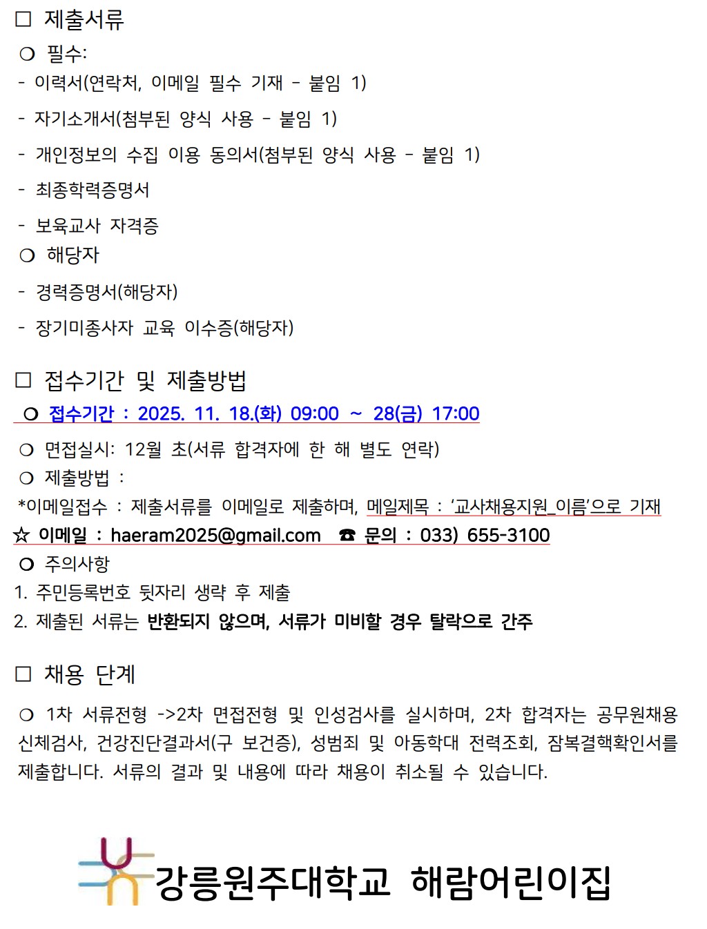 fnctId=bbs,fnctNo=208 강릉원주대학교 해람어린이집 보육교직원 모집 공고 작성일 2025.11.17 작성자 신시원 조회수 773 첨부파일 해람_교사채용지원양식.hwp 다음글 강원특별자치도자연학습원 직원 공개 채용 신시원 2026-01-12 10:57:21.0 이전글 해군1함대 사랑Dream 어린이집 교직원 채용 신시원 2025-11-10 14:40:03.0 총 16 개의 게시물이 있습니다. 게시물 검색 제목 작성자 게시글 리스트 취업정보 번호 제목 작성자 작성일 댓글 조회수 첨부파일 16 강원특별자치도자연학습원 직원 공개 채용 신시원 2026.01.12 0 332 1 15 강릉원주대학교 해람어린이집 보육교직원 모집 공고 신시원 2025.11.17 0 773 1 14 해군1함대 사랑Dream 어린이집 교직원 채용 신시원 2025.11.10 0 548 0 13 2025학년도 봉대초등학교병설유치원 하계 방학 중 방과후과정 인력 채용 공고 신시원 2025.06.20 0 2101 0 12 하이원 정선 어린이집(강원랜드 직장어린이집(한솔보육재단)) 보육교사 채용 공고 신시원 2024.07.17 0 5872 0 11 <원주소방서어린이집 담임교사 구인> 신시원 2024.03.11 0 5830 0 10 근로복지공단 동해어린이집 보육교직원 채용 공고 신시원 2023.11.24 0 4059 0 9 푸른자연 유치원 교사 구인 안내 신시원 2023.08.14 0 1743 0 8 2023년 강릉원주대학교 해람어린이집 교사 채용공고 신시원 2022.12.14 0 2215 2 7 근로복지공단 동해어린이집 보육교사 채용 공고 신시원 2022.11.23 0 2252 0 처음 12 1 2 다음 페이지 끝