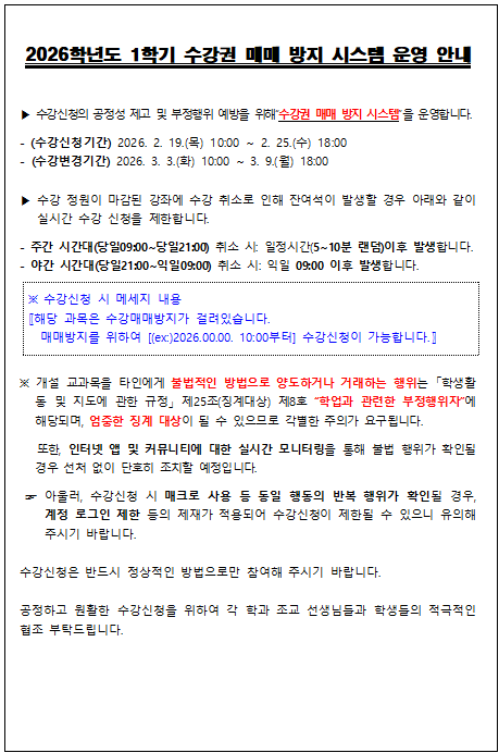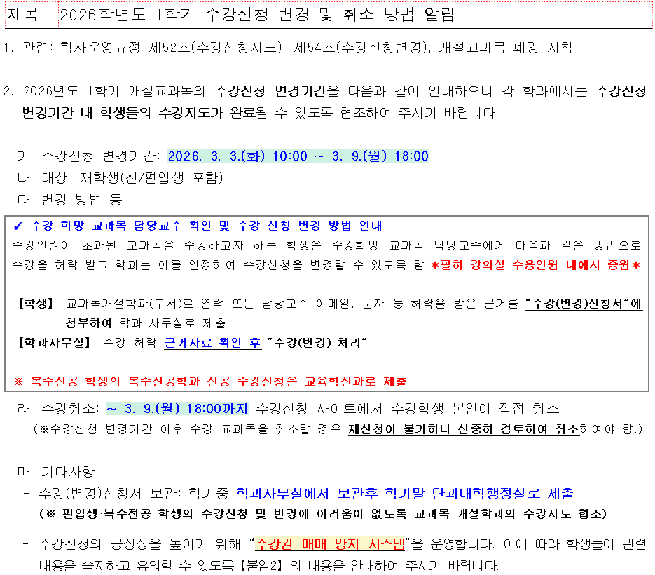 fnctId=bbs,fnctNo=880 2026학년도 1학기 수강신청 변경 및 취소 방법 알림 작성일 2026.02.26 작성자 홍승연 조회수 183 첨부파일 첨부파일이(가) 없습니다.